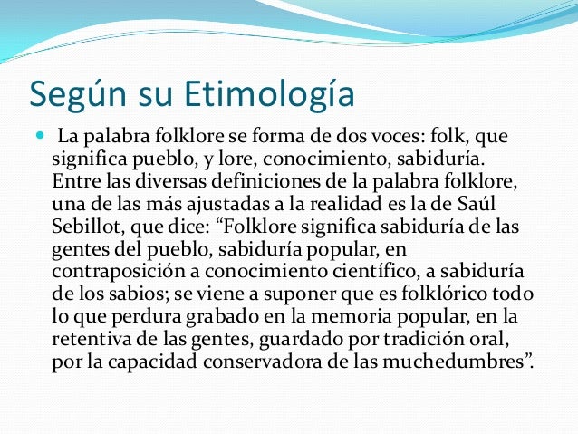 Es una composición entre las palabras anglosajonas folk en relación a pueblo gente raza y lore entendido como saber conocimiento y o ciencia se emplea un nuevo término que se interpreta como saber popular o saber tradicional del pueblo con el objetivo de reemplazar a lo.